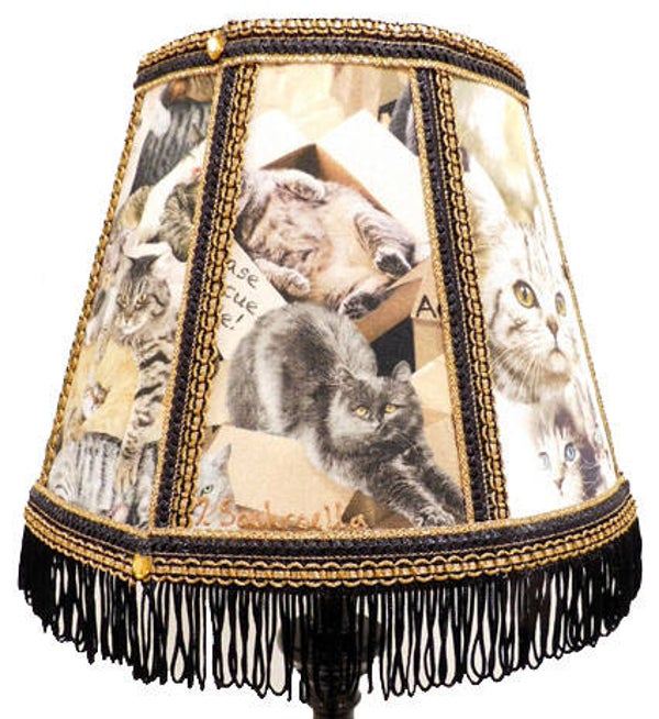 De kap bestaat uit maar liefst 8 verschillende, op elkaar afgestemde kattenstoffen. Iedere stof is lichtdoorlatend waardoor de lamp er ook geweldig uitziet als hij aan staat.