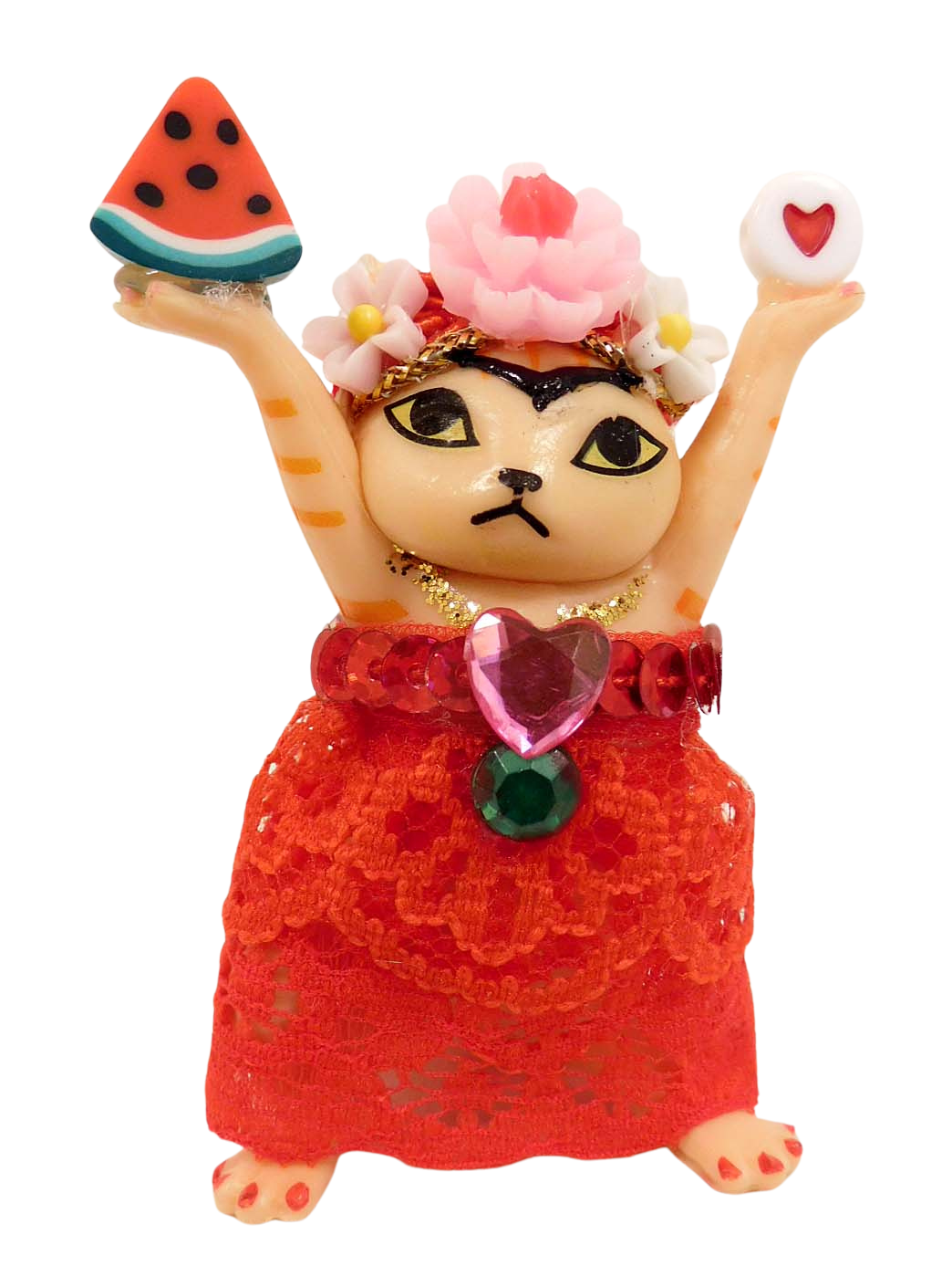 De poes is rood en de outfit bestaat uit een rood kanten jurkje met pailletten. Overige details: hartje op de borst, diverse kleuren bloemen op de kop, een stukje watermeloen en hartje, rode