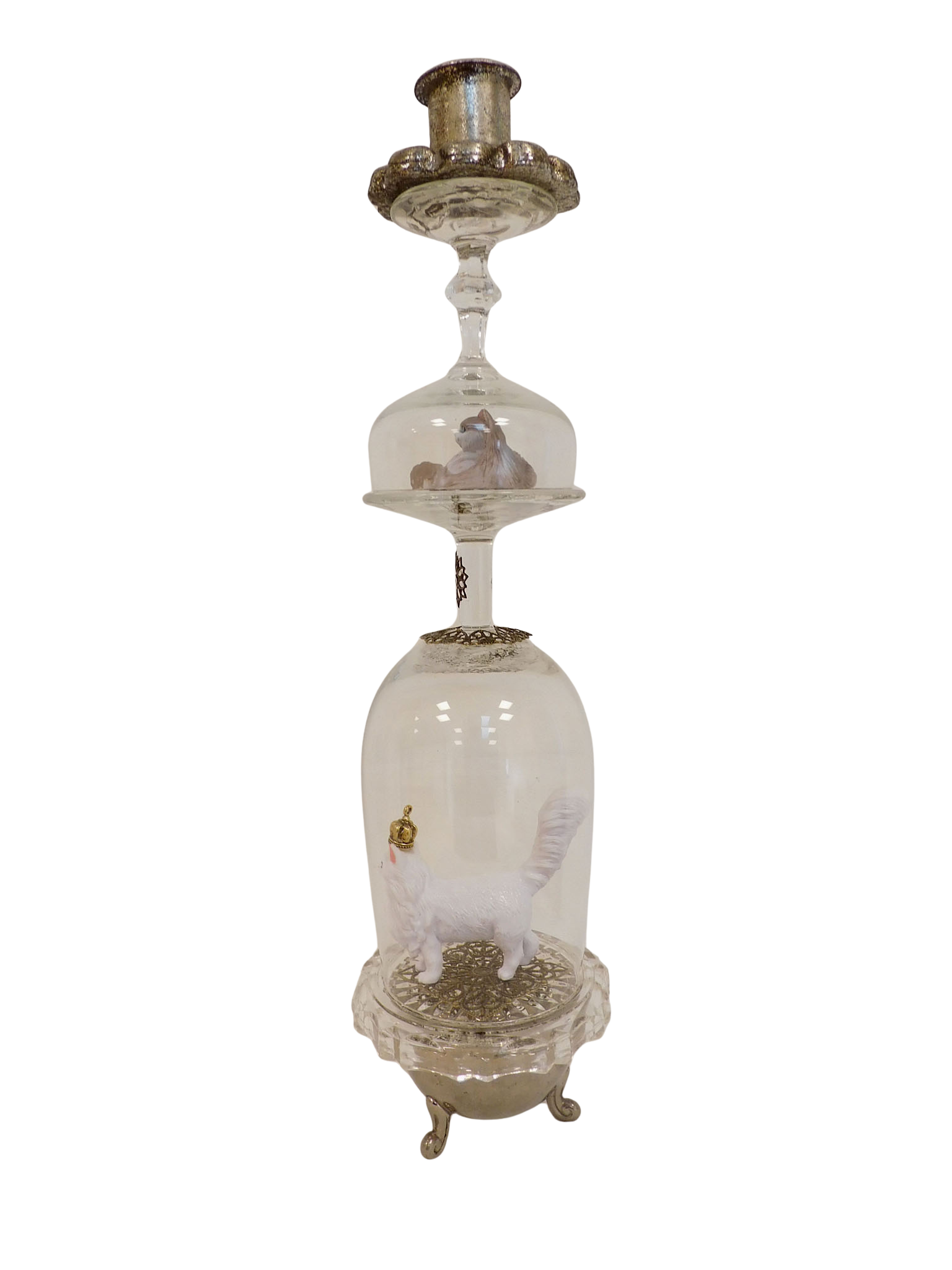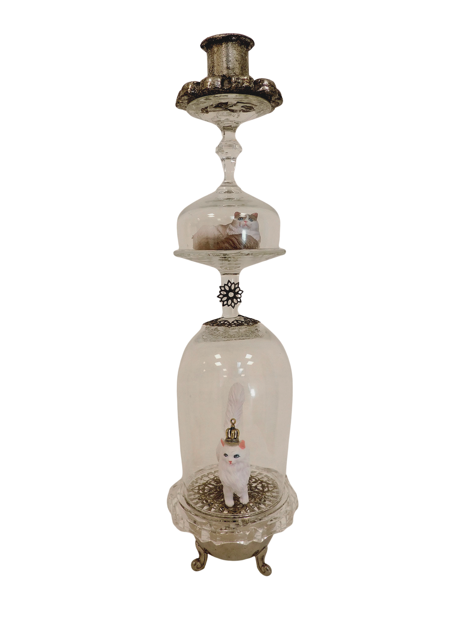 Een bijzondere kandelaar van gestapeld glas in combinatie met antiekzilveren details. Onder de 'stolp' op de bovenverdieping een liggend grijs/wit katje en onder een witte kat met een kroontje.