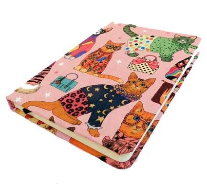 Een met de hand beklede A5 notitieboek voor de liefhebber van katten en uitbundige fashion.