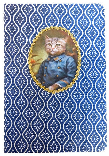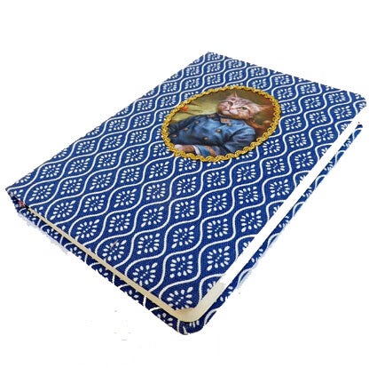 Een met de hand beklede A5 notitieboek met een basisstof in een blauw/wit grafisch patroon met daarop een mediallon van een kat in blauw uniform met eromheen goudkleurige sierband.