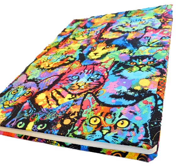 Een schetsboek voor de creatieve kattenliefhebber bekleed met een kunstzinnige, kleurrijke kattenprint.