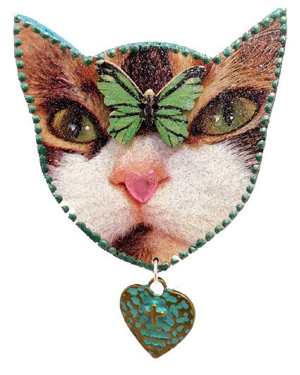 Een unieke met de hand gemaakte broche in de vorm van een kattenkop.