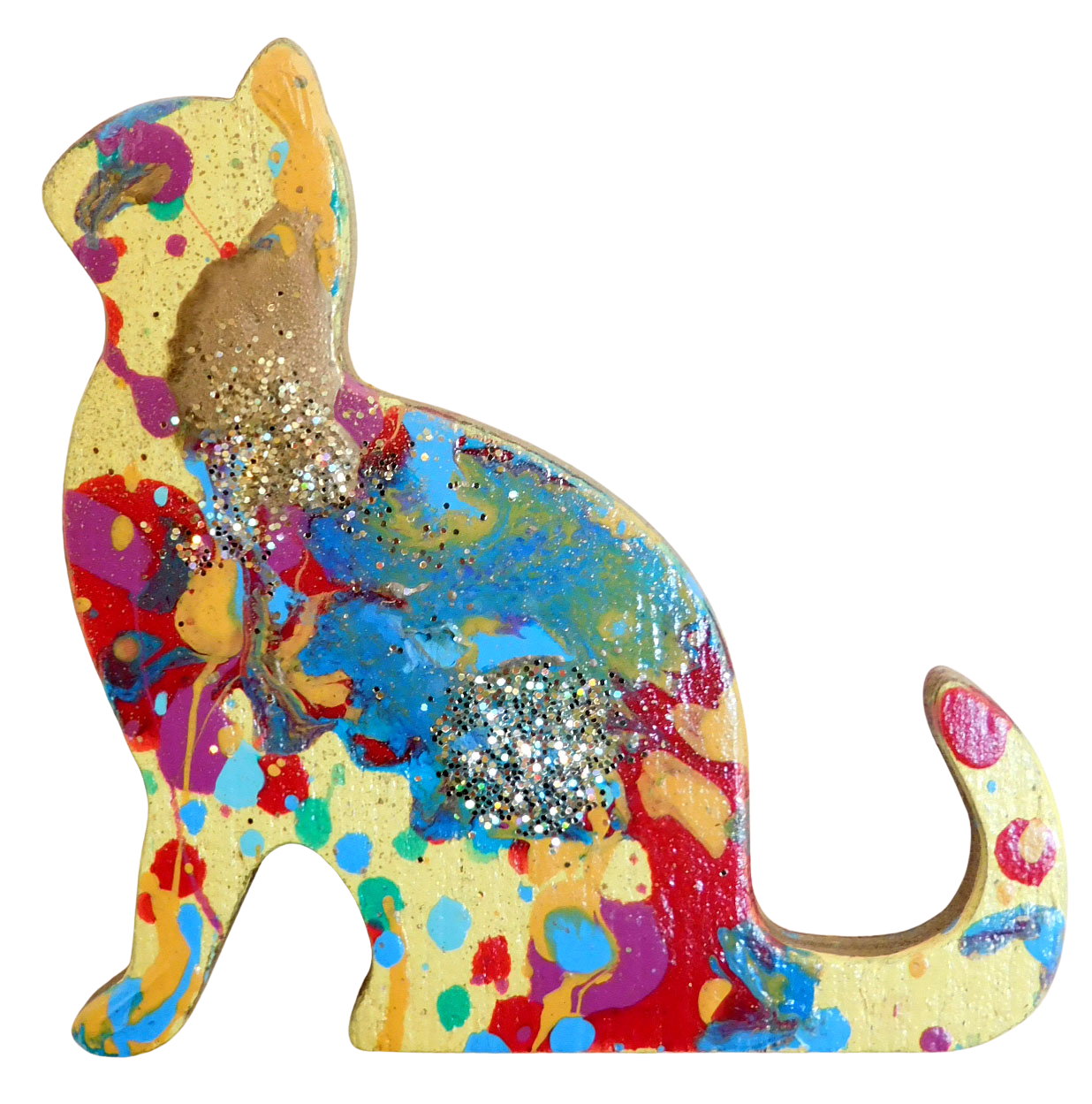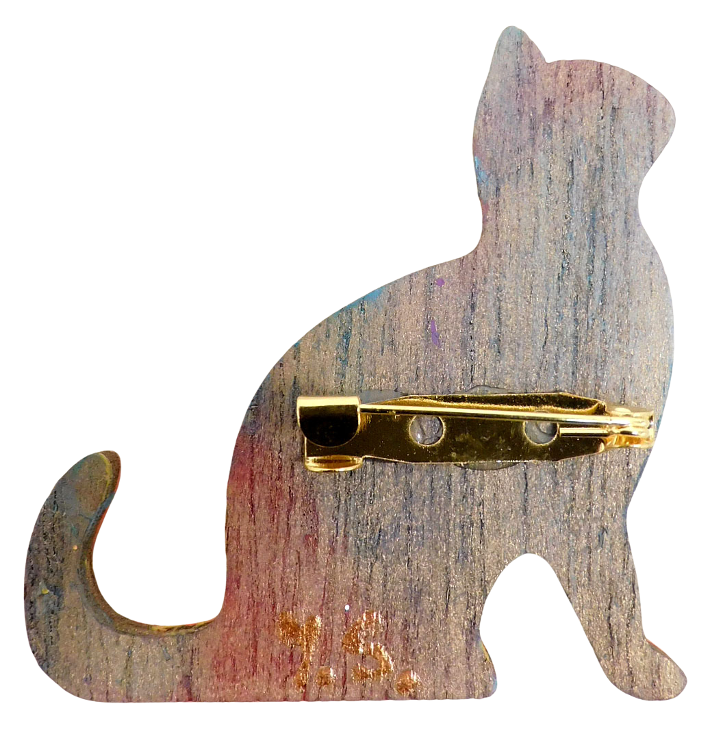 Unieke, kunstbroche van een zittende kat. De basis is van hout in combinatie met verschillende kleuren verfspatten en glitters.