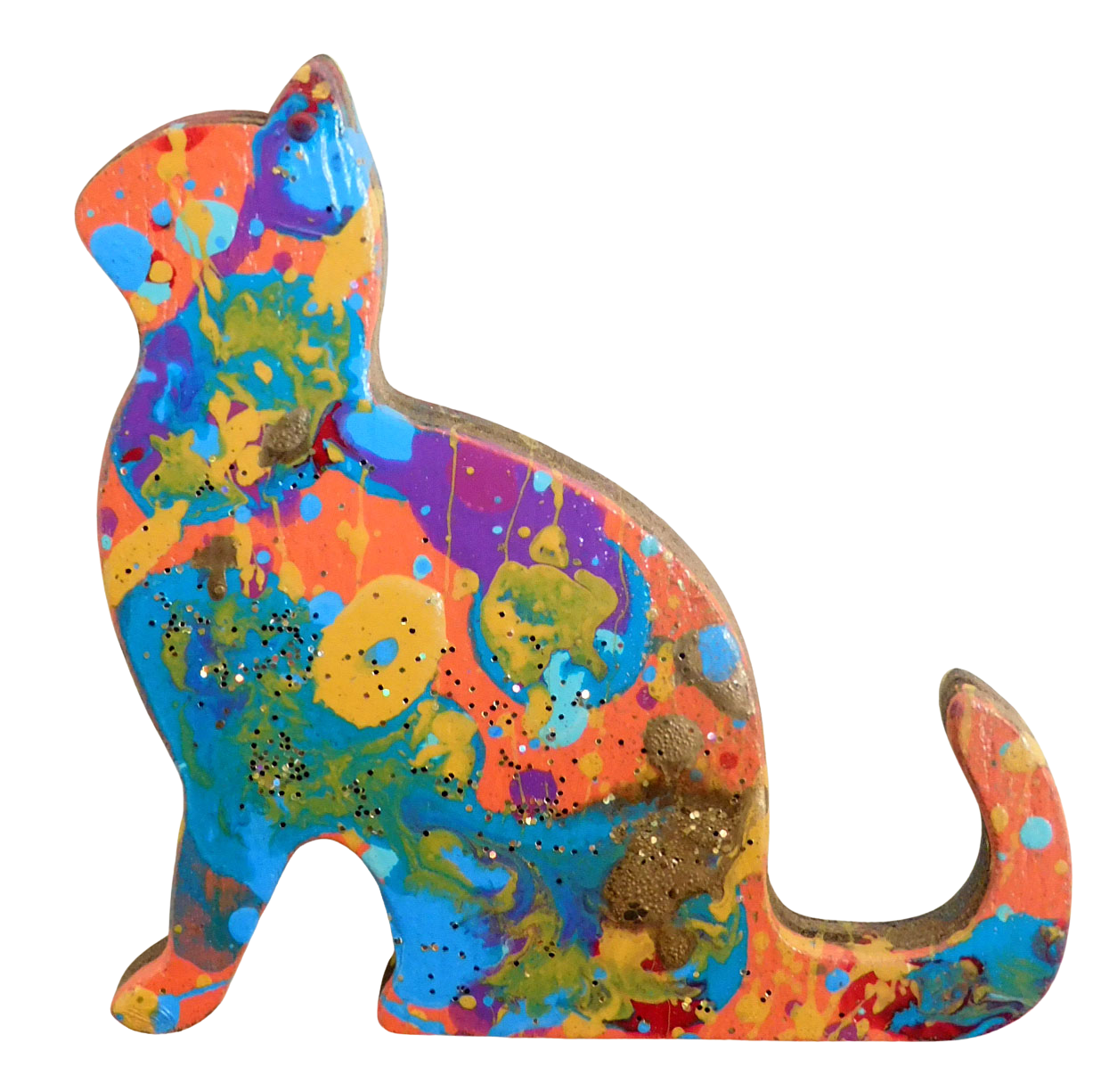 Unieke, kunstbroche van een zittende kat. De basis is van hout in combinatie met verschillende kleuren verfspatten en glitters.