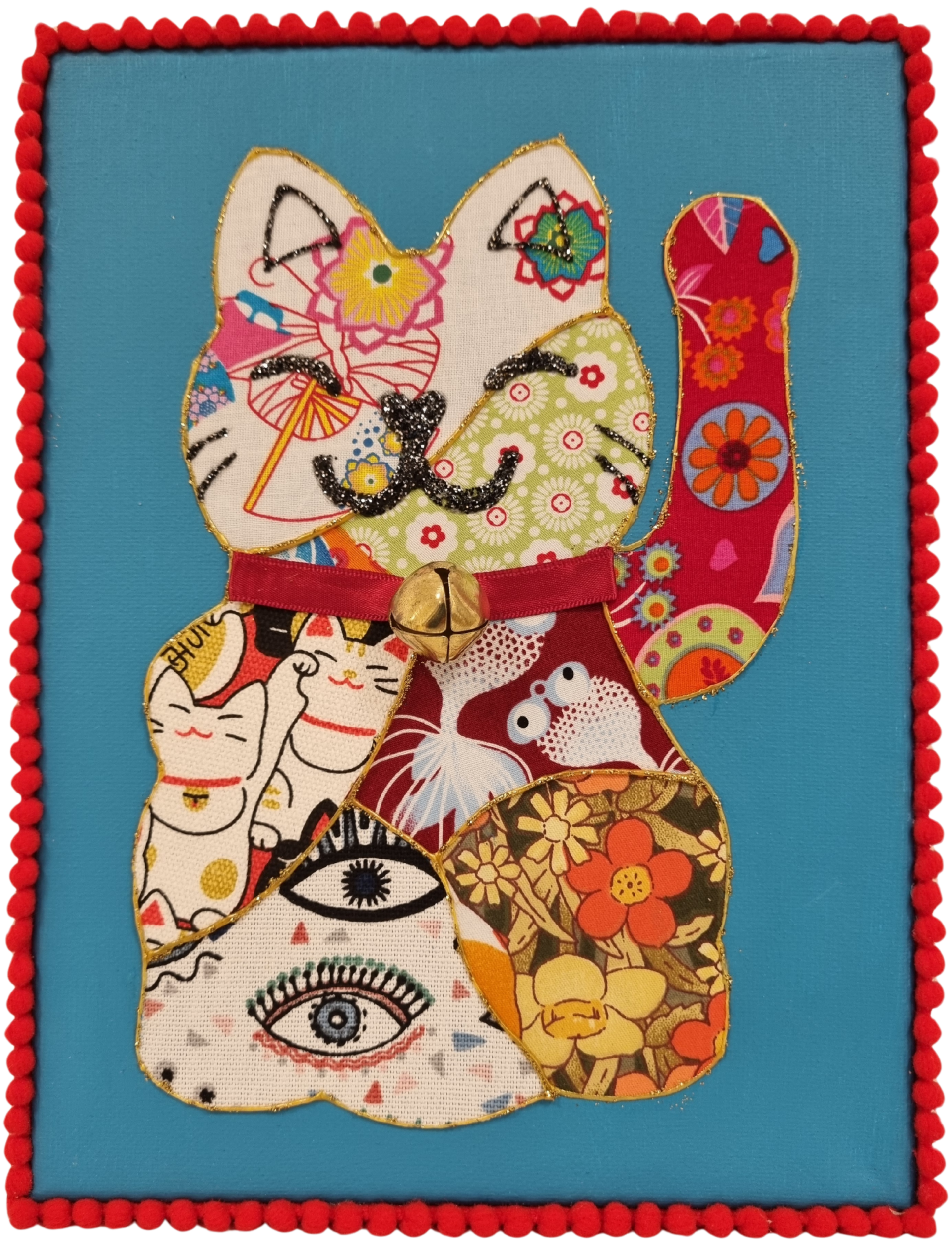 Een unieke stofcollage van een lucky cat. Deze kat staat bekend als gelukskat, Maneki Neko, en is oorspronkelijk Japans.