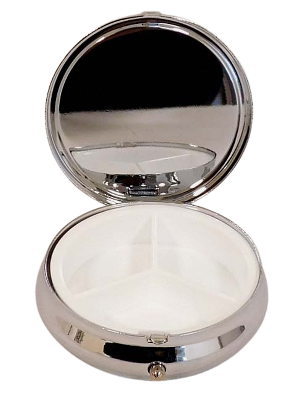 Het doosje gaat open met een klik op het knopje. Aan de binnenkant zitten 3 vakjes en in het deksel een spiegeltje.